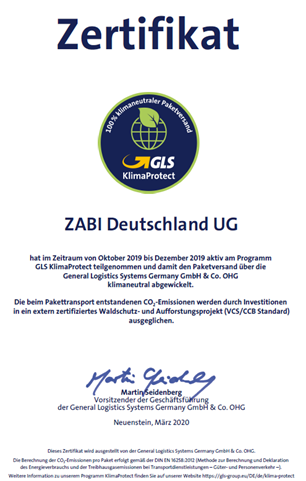 Der Umweltschutz ist uns sehr wichtig, weshalb die ZABI Deutschland UG gerne am Klimaschutzprogramm des Kurierdienstes GLS teilnimmt. ZABI-Produkte wie Metallräder mit Gummireifen oder Gummirollen werden mit Rücksicht auf die Umwelt hergestellt. Die ZABI Deutschland UG bezieht einen Teil der Rohstoffe aus dem Recycling und verwendet sie zur Herstellung von Gummireifen. Auf diese Weise schützen wir unseren Planeten und begrenzen die Abgabe von Produktionsabfällen in die Umwelt. Der Transport innerhalb der Anlage wird mit Elektrofahrzeugen durchgeführt. Darüber hinaus setzen wir ökologische Maßnahmen ein, wie energiesparende LED-Technologie, Wärmerückgewinnung von Maschinen, die Kunststoff, Polyamid und Polypropylen spritzen, die wir später für die Raumheizung nutzen können. Durch den Versand über GLS sind wir sicher, dass alle Pakete mit Rädern und Rollen in ganz Deutschland 100% klimaneutral ausgeliefert werden. Auf diese Weise tragen wir zur Reduzierung der CO2-Emissionen bei. Damit leisten wir gemeinsam mit der ZABI Deutschland UG und der GLS einen aktiven Beitrag zum Klimaschutz und zu einer nachhaltigen, zukunftsorientierten Logistik für Pakete mit unseren Produkten wie Transportwagen, Räder für Hubwagen und Schiebetürwagen. Im Folgenden möchten wir Ihnen unsere Umweltzertifizierung vorstellen.