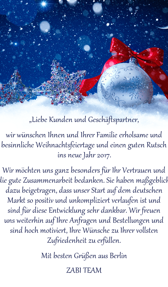 „Liebe Kunden und Geschäftspartner,wir wünschen Ihnen und Ihrer Familie erholsame und besinnliche Weihnachtsfeiertage und einen guten Rutsch ins neue Jahr 2017. Wir möchten uns ganz besonders für Ihr Vertrauen und die gute Zusammenarbeit bedanken. Sie haben maßgeblich dazu beigetragen, dass unser Start auf dem deutschen Markt so positiv und unkompliziert verlaufen ist und sind für diese Entwicklung sehr dankbar. Wir freuen uns weiterhin auf Ihre Anfragen und Bestellungen und sind hoch motiviert, Ihre Wünsche zu Ihrer vollsten Zufriedenheit zu erfüllen.Mit besten Grüßen aus BerlinZABI TEAM