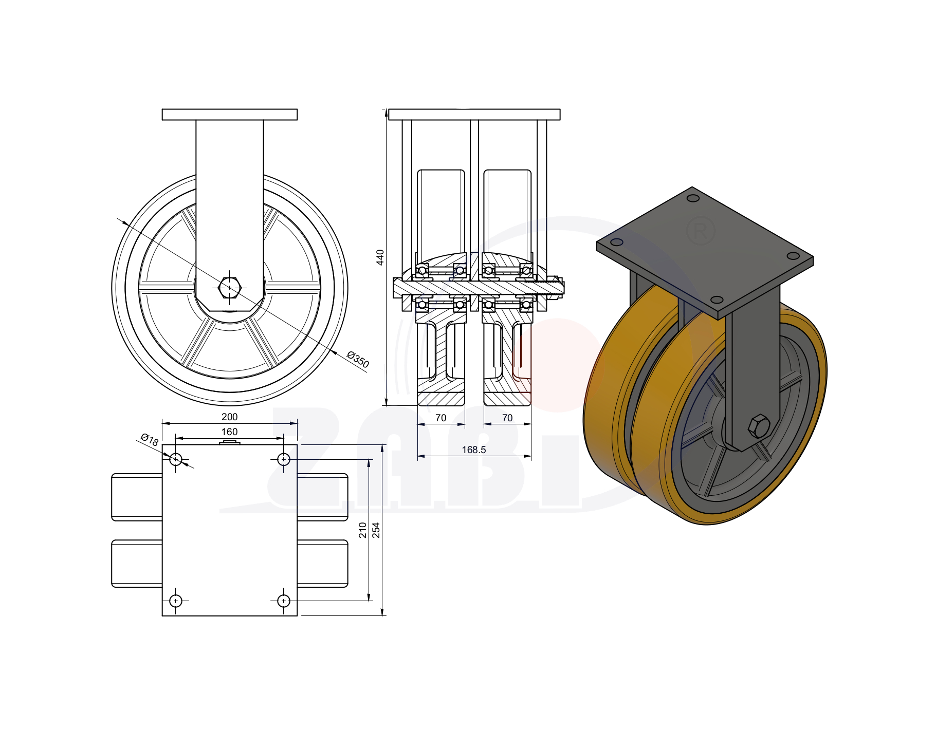 Gussräder aus Polyurethan, Doppel Gussräder aus Polyurethan im Gehäuse für große Belastungen, Bockrollen mit dem Symbol 3503ZP2